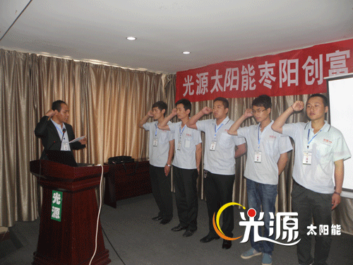 會議中湖北區(qū)域經(jīng)理劉進輝帶領團隊進行的宣誓儀式,充分展現(xiàn)了光源太陽能有限公司的員工風貌及企業(yè)精神。利用新能源,保護美好家園,傳承正能量,將會議推進高潮。