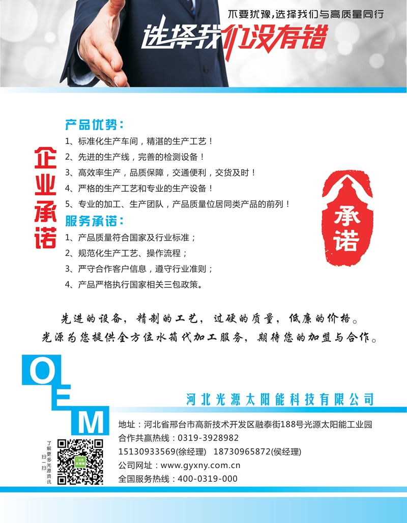 河北光源太陽能科技有限公司是一家集太陽能光熱產(chǎn)品研發(fā)、生產(chǎn)、銷售為一體的專業(yè)化骨干企業(yè)。公司地址位于河北省邢臺(tái)經(jīng)濟(jì)開發(fā)區(qū),總占地150畝,建筑面積5.2萬平方米,現(xiàn)有員工420人。主導(dǎo)產(chǎn)品:一是太陽能真空集熱管;二是家用型太陽能熱水器;三是集中式中高溫太陽能工程的設(shè)計(jì)、生產(chǎn)與施工。企業(yè)規(guī)模為河北省太陽能熱利用行業(yè)榜首,國內(nèi)業(yè)界名列前茅。