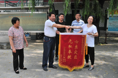 在村委會大院里,舉行了簡短的捐贈儀式。 王德英代表全村600多名受災鄉(xiāng)親,從光源公司辦公室主任劉琛手中接過5000元人民幣,連連表示感謝,并向光源公司贈送錦旗一面,上寫“心系災區(qū),無私奉獻”。光源公司業(yè)務(wù)經(jīng)理郭暉從王德英手中接過錦旗,握手合影留念。