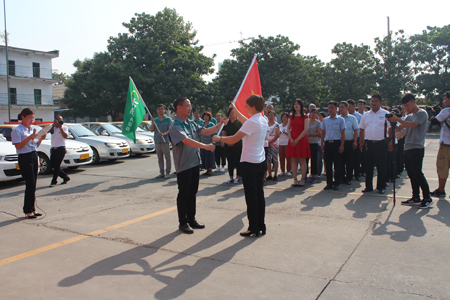 圖二:(劉迎波總經(jīng)理將旗幟傳遞給九州駕校集團李潔總經(jīng)理)