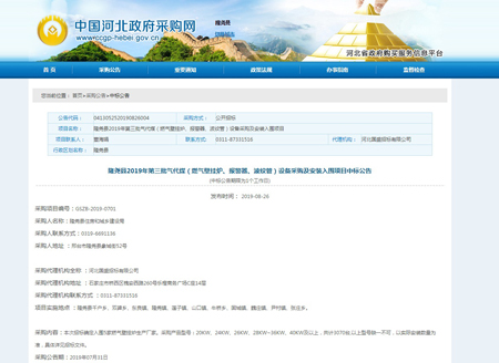 捷報頻傳, 熱烈祝賀我公司(河北光源太陽能科技有限公司)2019年08月22日中標(biāo)隆堯縣2019年第三批氣代煤(燃氣壁掛爐、報警器、波紋管)設(shè)備采購及安裝入圍項目。本次中標(biāo)又一次認可了我公司的產(chǎn)品質(zhì)量,驗證了我公司的實力。
