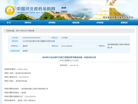 喜報(bào)頻傳,河北光源太陽(yáng)能科技有限公司,在2019年09月16日,2019年王官莊鎮(zhèn)氣代煤工程壁掛爐采購(gòu)及安裝項(xiàng)目的競(jìng)標(biāo)中,憑借過(guò)硬的產(chǎn)品質(zhì)量,扎實(shí)高效的工作作風(fēng),卓越的運(yùn)作團(tuán)隊(duì)和良好的企業(yè)信譽(yù),以絕對(duì)的優(yōu)勢(shì)順利中標(biāo)。