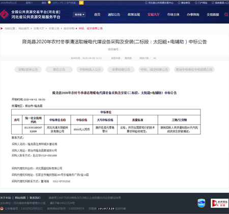 河北光源太陽能科技有限公司憑借完善細致的服務(wù)成功中標(biāo)隆堯縣2020年農(nóng)村冬季清潔取暖電代煤設(shè)備采購及安裝(二標(biāo)段:太陽能+電輔助)。中標(biāo)喜訊紛至沓來,彰顯了本公司專業(yè)的施工實力與良好的市場口碑。