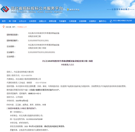 在抗疫的關(guān)鍵時期,復(fù)工復(fù)產(chǎn)正在如火如荼的進(jìn)行,沒有什么能比一份中標(biāo)通知書更能振奮人心了。在營銷工作舉步艱難的特殊時期,河北光源太陽能科技有限公司,中標(biāo)內(nèi)丘縣2020年度農(nóng)村冬季清潔取暖設(shè)備采購及安裝工程,為我公司2020年度輝煌的經(jīng)營業(yè)績再添濃墨重彩的一筆。